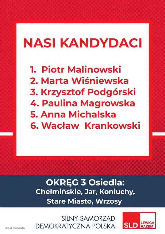 Prezentujemy kandydatki i kandydatów startujących w ramach Koalicyjnego Komitetu Wyborczego SLD Lewica Razem do Rady Miasta Torunia oraz program wyborczy – „Toruń Miastem Przyjaznym".